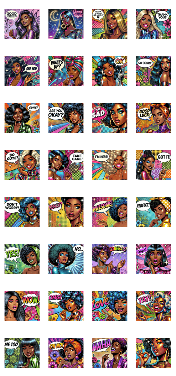 アフリカの黒人女性スタンプ!あいさつ/日常英語/カラフル/かっこいい/おしゃれ/コミック風/楽しい/輝き/OK