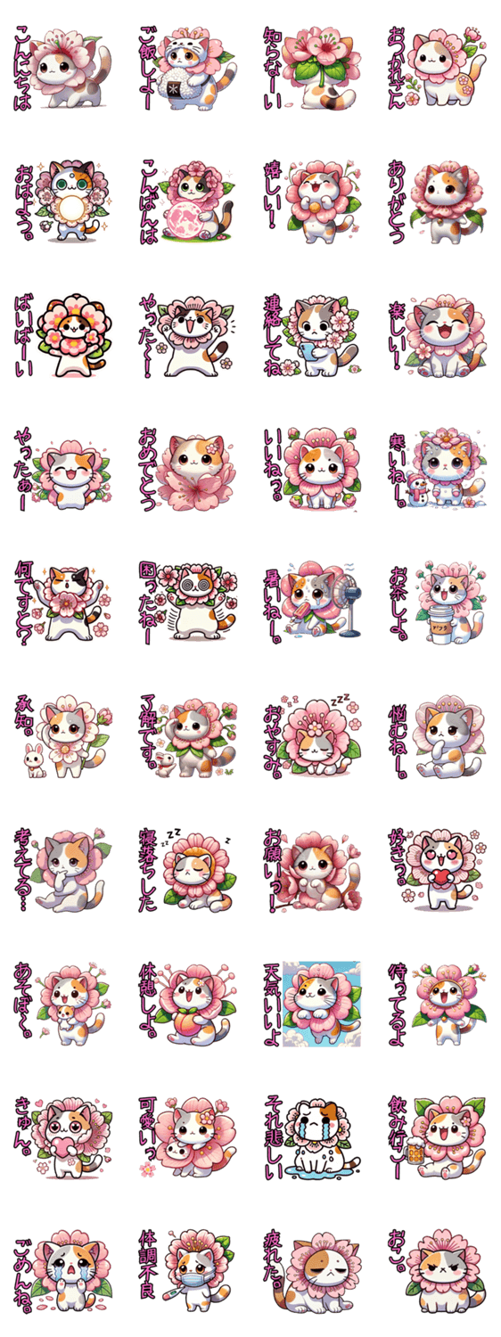 | スタンプ説明 | 花猫シリーズ第一弾の向日葵にゃんに続く弾二弾の桜にゃん。可愛すぎてごめんなさい。クリスマス仕様のポインセチアにゃんと共に可愛がってあげて下さい。ぬいぐるみ化は⁇ |