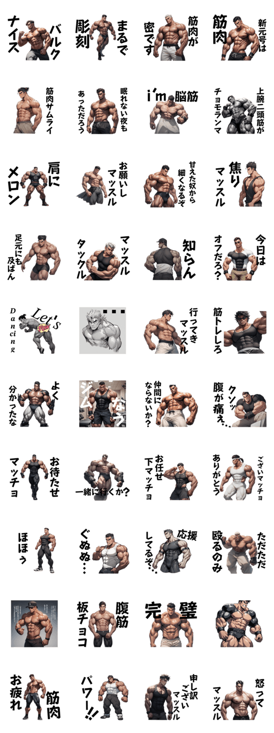 ボディービルでも使われる応援の掛け声が多めに入った普段の会話でもネタ会話でも使える筋肉ムキムキマッスルスタンプです!!