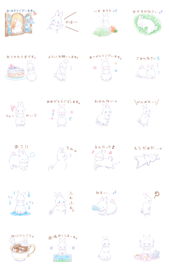水彩や絵本のようなやわらかいタッチをめざしたうさぎのスタンプです。挨拶や日常で使える言葉が豊富です。