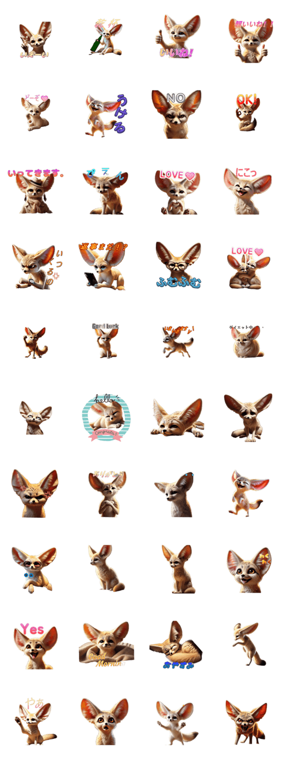 リアルでかわいいオオミミギツネのスタンプが登場!日常の会話に使いやすい表情豊かなデザインが魅力。ユニークな耳と愛らしさでトークを彩ろう!フェネクに似てるね!!
