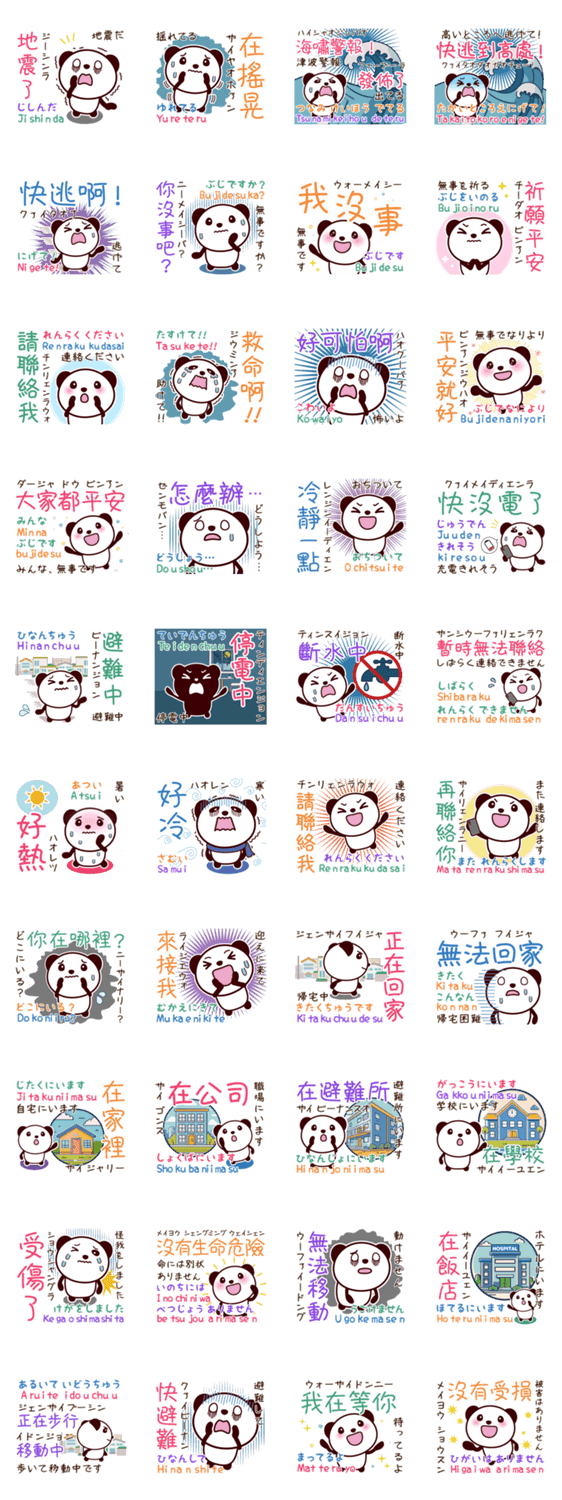| スタンプ説明 | 無難で可愛いパンダの2ヶ国語_日本語・中国語(繁体字)スタンプです。 災害の緊急時にご活用下さい。 地震/災害救助/震災/防災/安否確認/地震 |