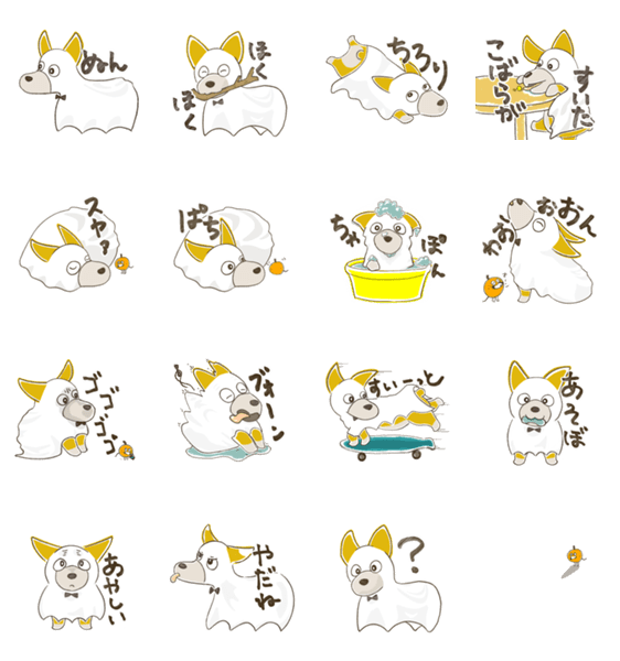 あなたのコーギーはいつもそこに。ゴーストなコーギーの幸せな日常をスタンプにしました。友達のネズミゴーストが被っているのは金柑。