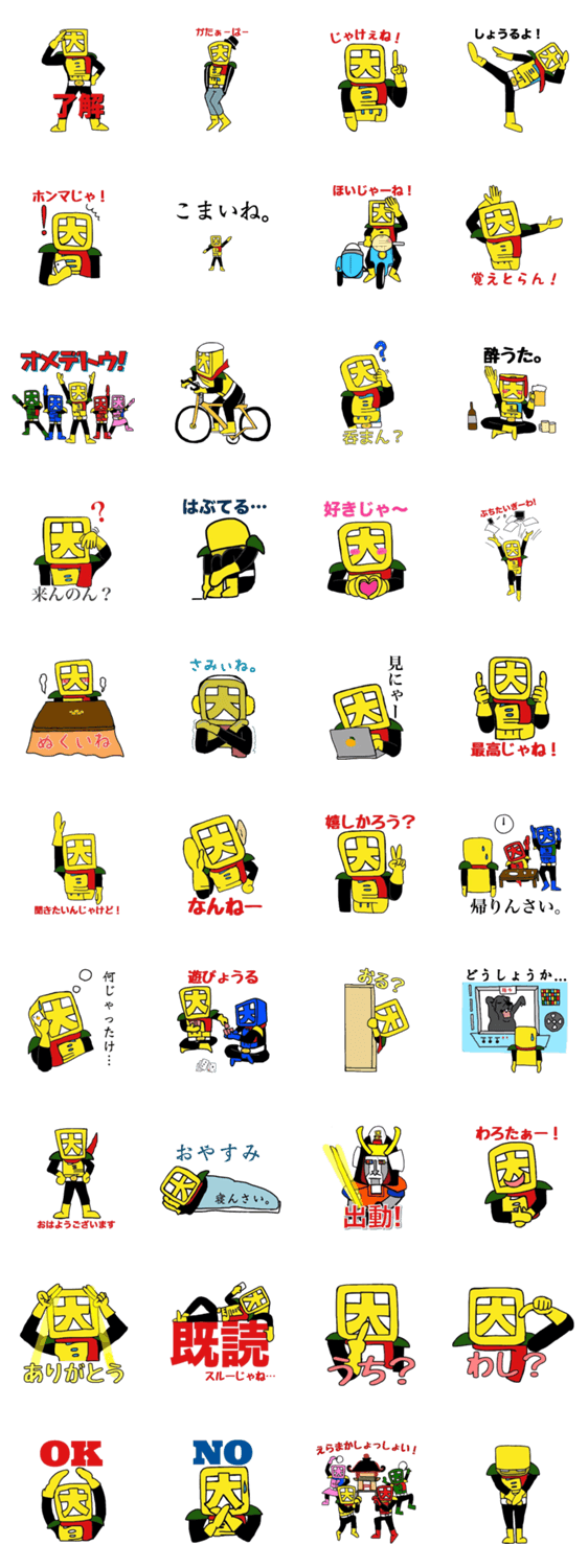 広島県因島を守る為だけにやってきた「いんのしマン」のスタンプです。因島を知っている人も知らない人も是非使ってみんさい♪