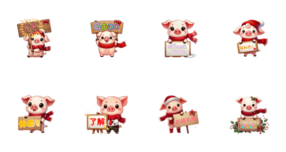 生成AIで作成したキュートなブタのイラストです。OK/GOOD/Thank You/なんと/休め/了解/お疲れ様/ごはんたべる。LINEスタンプメーカーでつくったスタンプです。