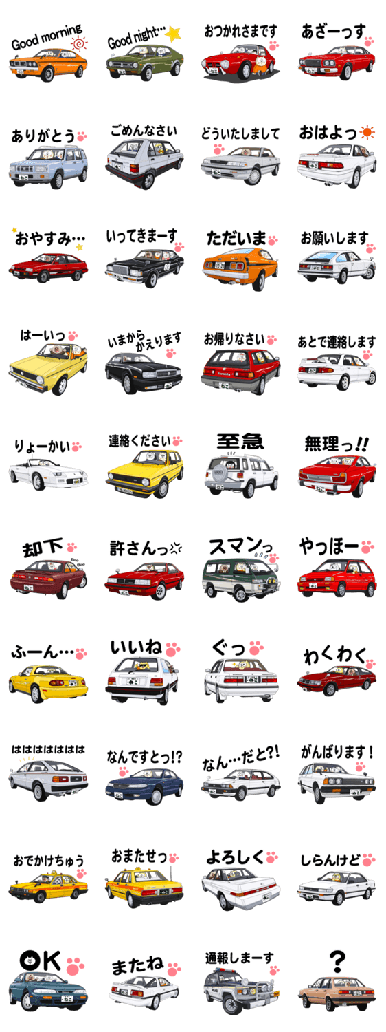ごろんたたちがなつかしの車に乗っておもいを伝える楽しいスタンプの第11弾、お仕事や先輩にも使える丁寧な言葉でトークに役立つこと間違いなしですにゃ!