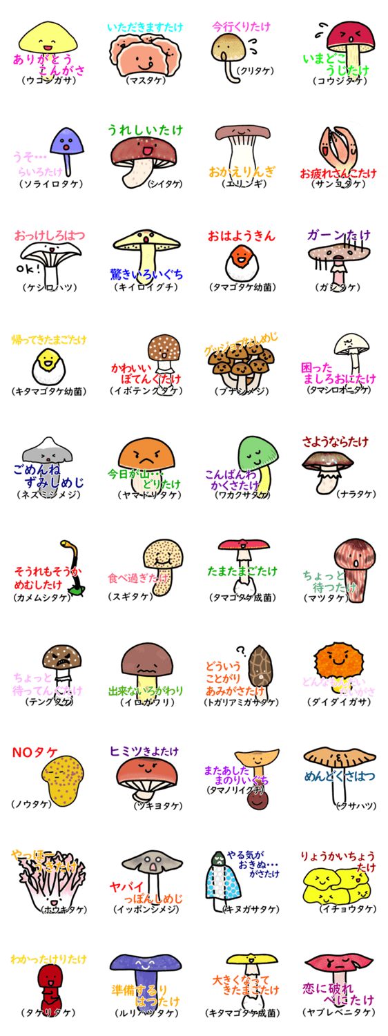 しいたけ、たまごたけなど、いろいろなきのこのスタンプです。きのこの同定には使えません。(メッセージなしバージョンもあります)