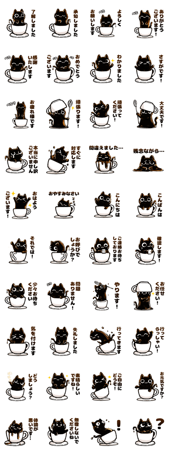 普段使いができる、猫のようなコーヒーのようなキャラクターの反応を送りやすいスタンプです。