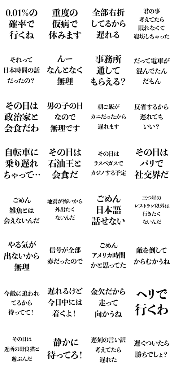 | スタンプ説明 | 遅刻、遅れる、おもしろい、おもしろい、例、使える、うざい、ギャグ |