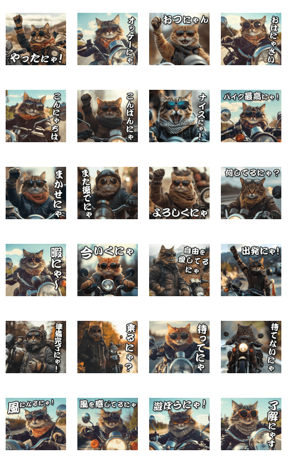 | スタンプ説明 | バイクに乗ったクールなライダー猫が、あなたのトークをスタイリッシュに彩ります。迫力満点のイラストで、かっこよさを存分に楽しんでください! |
