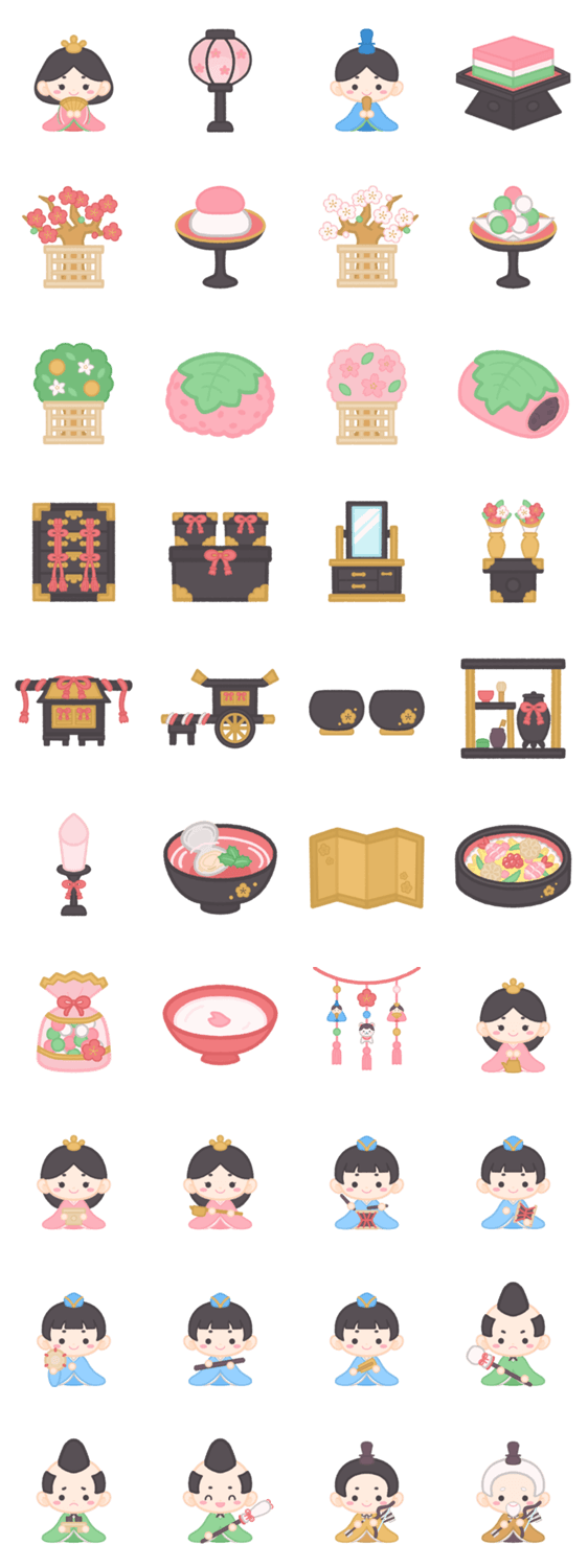 ひな祭りなアイテムを集めた文字なしスタンプです!【写真デコ/春/ひなまつり/雛祭り/梅/桜/ひな人形/雛人形/日本/和風/桃の節句/イベント/季節/かわいい/手描き風/便利】