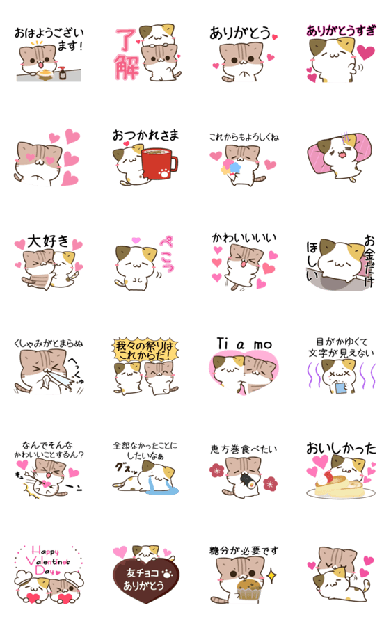 お疲れ気味やる気が出ない時に!ゆるかわ三毛猫とキジトラ白猫のアニメーションスタンプ 節分 花粉症 連絡 家族 バレンタイン 敬語 チョコ カップル ハート ピンク 彼氏彼女