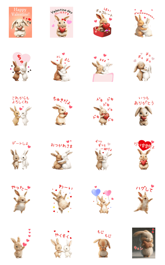 ふわふわでキュートなうさぎが、あなたの愛や感謝の気持ちを届けます♥ バレンタインや特別な日、日常の中で大切な人へ気持ちを伝えるのに心を込めて送ってみてください! ※このスタンプはトークルームで大きく表示されるBIGスタンプです。
