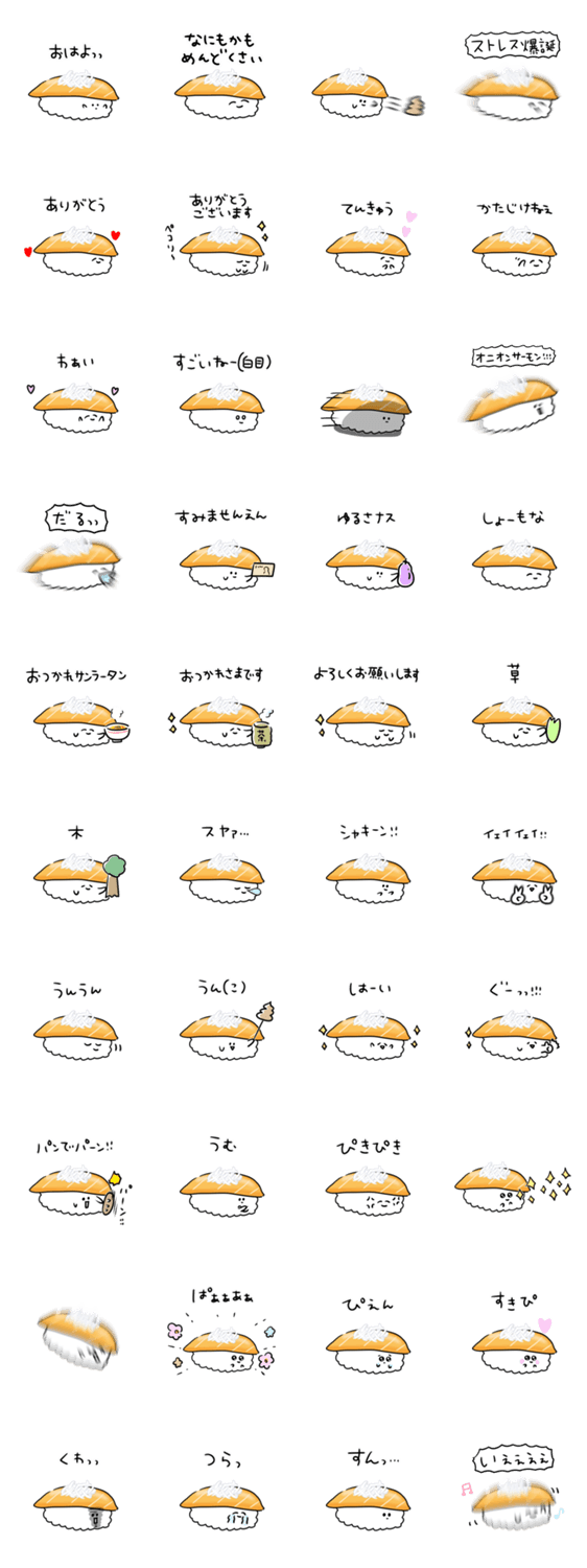 おにおんさーもんのおすしのシンプルで使いやすいスタンプです。[ゆるかわ シュール 可愛い 食べ物 敬語 ダジャレ 毒舌]