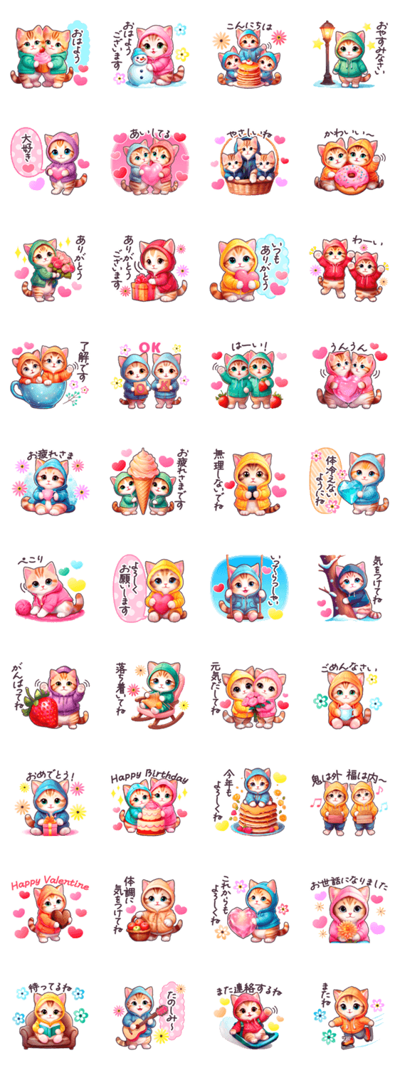 パーカーを着たネコのハート多めの日常スタンプ。猫/ねこ/ネコ/子猫/子ねこ/毎日/連絡/挨拶/グループ/家族/友達/PTA/毎日使える/ハート/気持ちを伝える/バレンタイン/冬/春