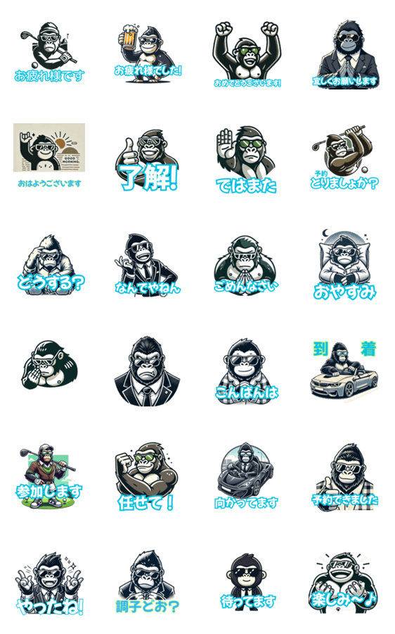 | スタンプ説明 | サングラスをかけたゴリラ「ごりさん」のゴルフスタンプが登場!ゴルフ好きなごりさんが、いろんなシーンであなたのトークを盛り上げます。ゴルフ仲間との会話にピッタリ! |