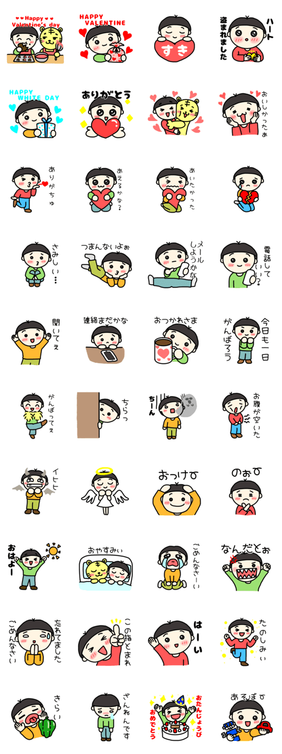 バレンタインやホワイトデー、大好きやかまってちゃんな気持ちが溢れる、ぱっつん前髪おちゃめな男の子のスタンプです。家族やお友達にどうぞ。