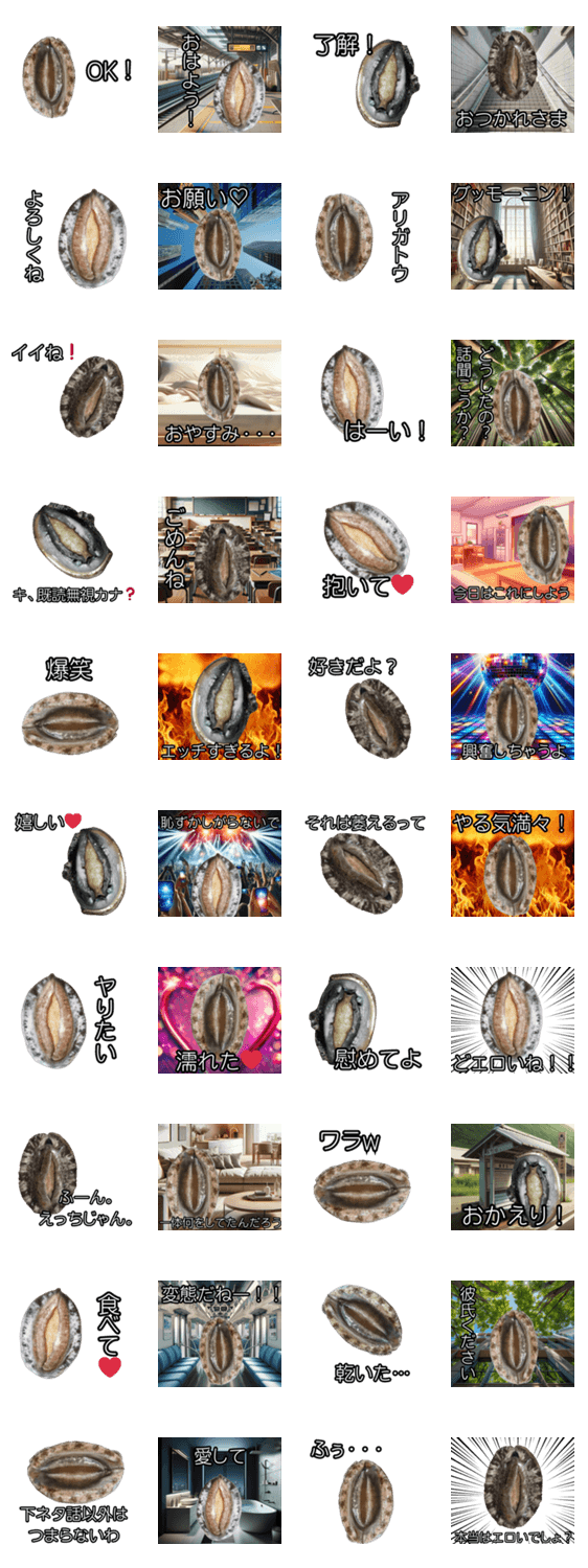 | スタンプ説明 | あおりにも使えそうなおもしろい鮑(あわび)のスタンプです。 |