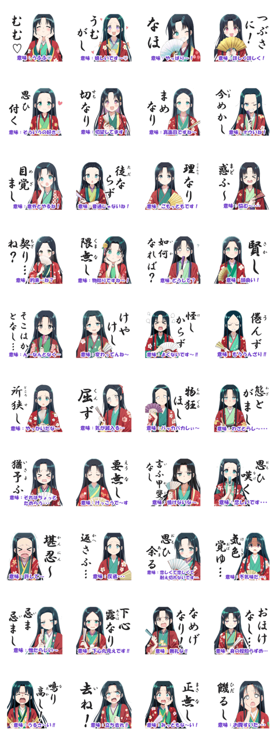 | スタンプ説明 | 現代語訳付きの古語会話スタンプ第6弾です!古文/古典文学/平安時代/大学入試/高校生/受験/勉強/単語/十二単/貴族/日本史/歴史/国語/いとをかし/文系/日本語/和服/着物 |