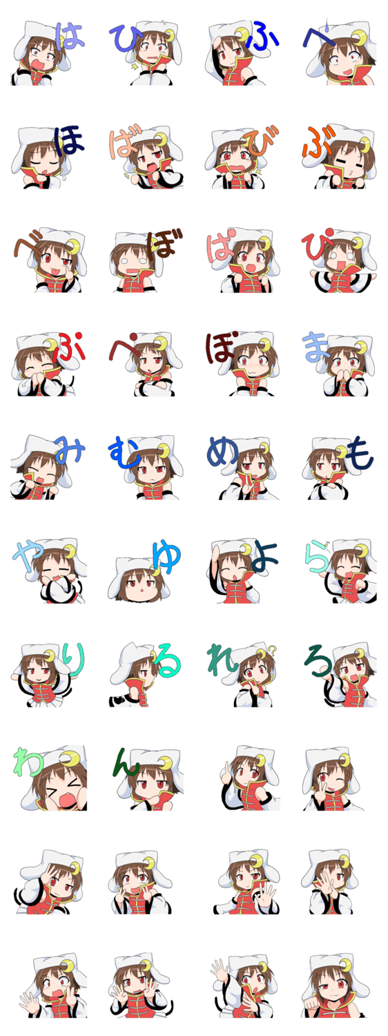 日本語のひらがな一文字で表される表情スタンプです。「は」~「ん」+「0~9」の一文字ずつが書かれています。濁点もあるので、組み合わせて言葉を作ることもできます。