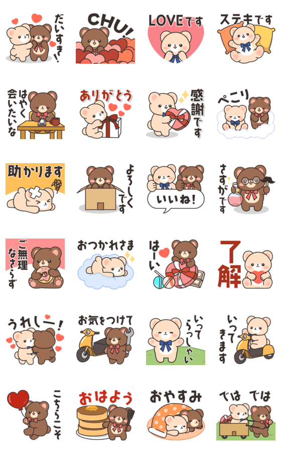仲良しのクマちゃんたちのスタンプです。感謝の言葉や大好きを伝える言葉がたくさんあるので、バレンタインの時期にも日常づかいにもぴったり♪