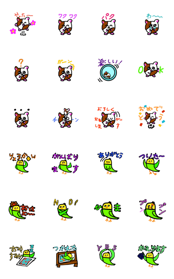 ペットのハムスターとインコによる、家族にも友達にも使えるかわいいスタンプです。