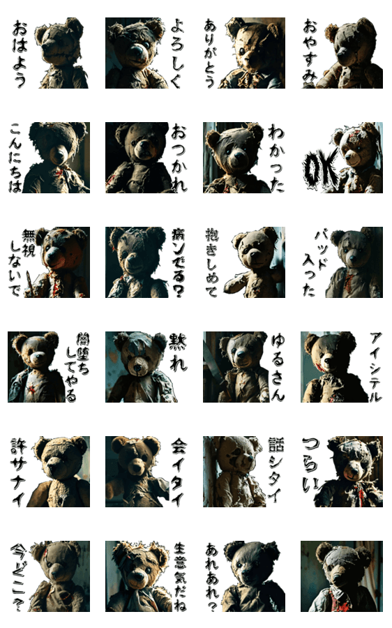 めちゃくちゃ怖いのに、なんかかわいい?そんなテディベアのスタンプです。憎悪とふわふわに満ちた心地のいいトークをどうぞ。/ホラー/病み可愛い/ヤンデレ/ダーク/