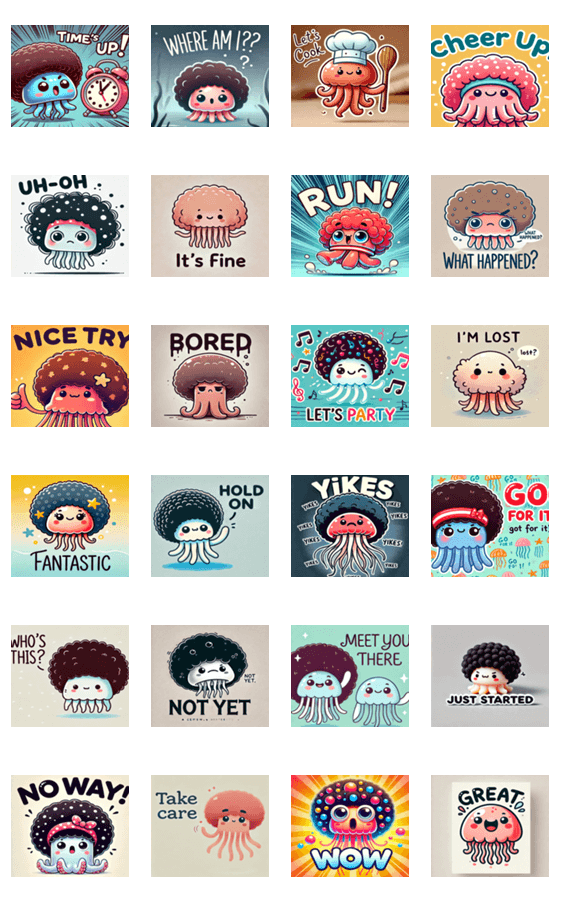 さまざまな感情を表現するアフロクラゲのスタンプセットです。楽しい会話にぴったりです!