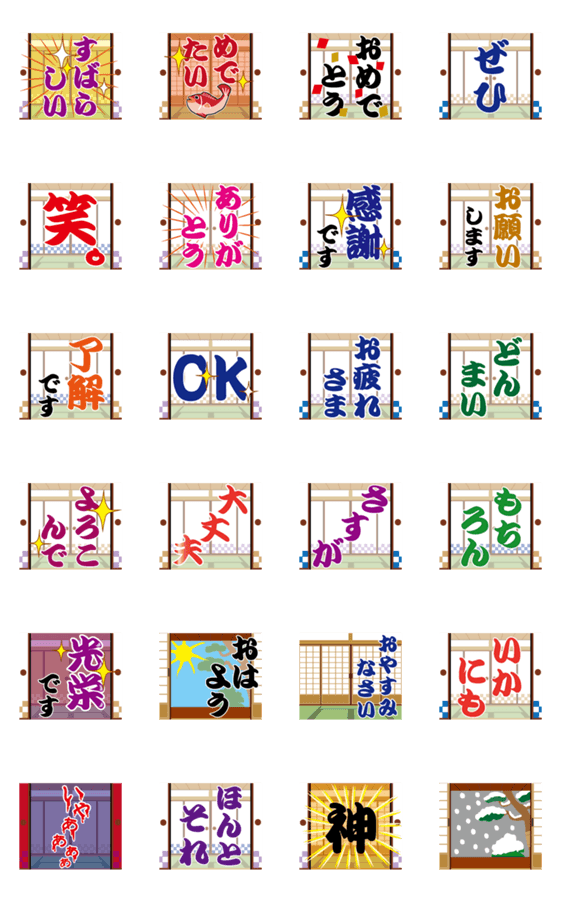 ふすまを開けて部屋の奥に進んでいくと、毎日の会話に使えるメッセージが出てきます。文字の出方もバリエーションあり。日常会話に。お祝い/感謝の言葉もあり。