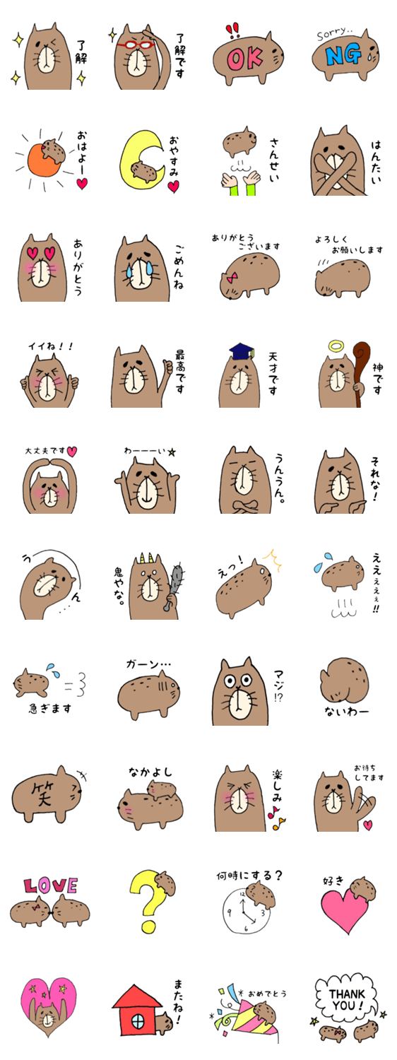 | スタンプ説明 | カピパラじゃなくて、カピバラです。普段よく使う言葉を集めてみました。 |