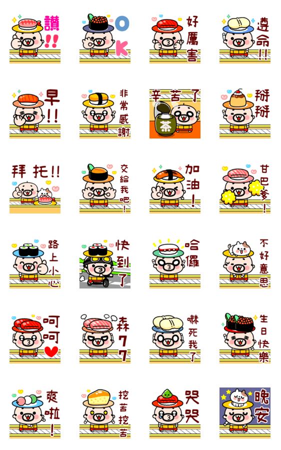 可愛いおじさん『おやじ君』と回転寿司のコラボ!お寿司と一緒におやじ君が流れてくる楽しいスタンプ登場。デザートのスイーツもあるよ。友達に送れば喜ばれるに違いない!