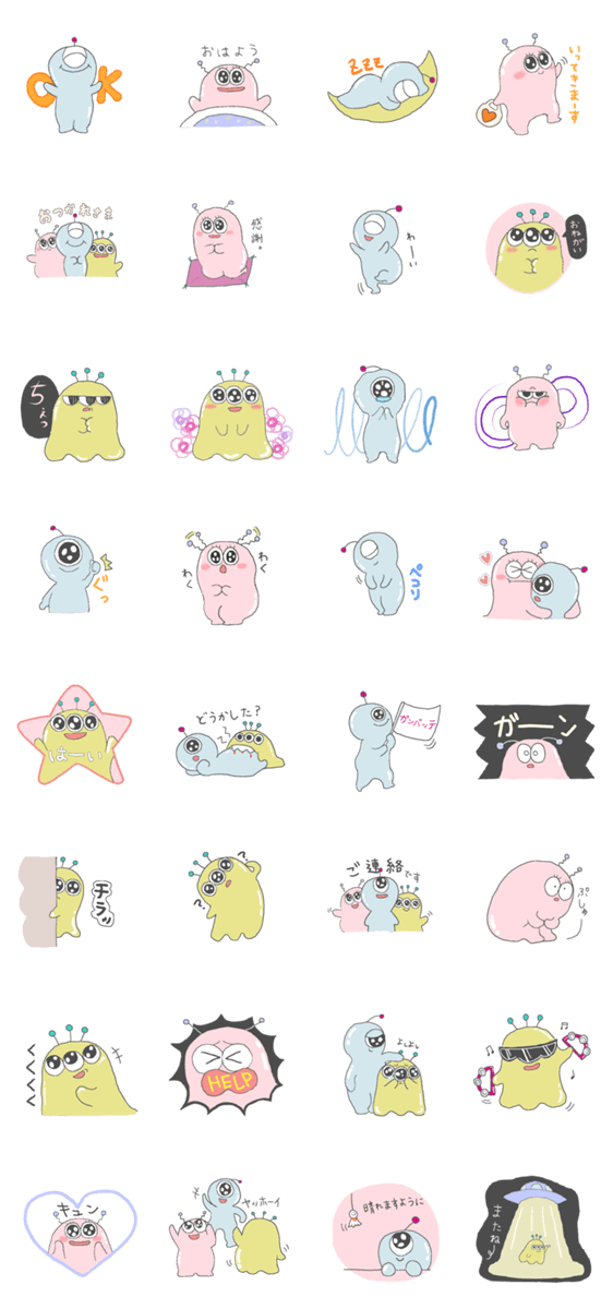 宇宙人きょうだい3人のてきとーで呑気なカラフルスタンプです