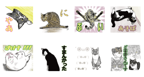 デッサン風でリアルに描かれた猫達のユニークな姿をお楽しみください。 ハチワレ、キジシロ、キジトラ、白猫のうちの子たちが登場します。