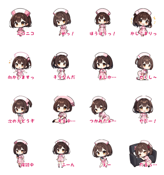 優しくて可愛いナースが織りなす日常スタンプです。癒し系からちょっぴりコミカルな表情まで、いろいろなシーンで使えます♪