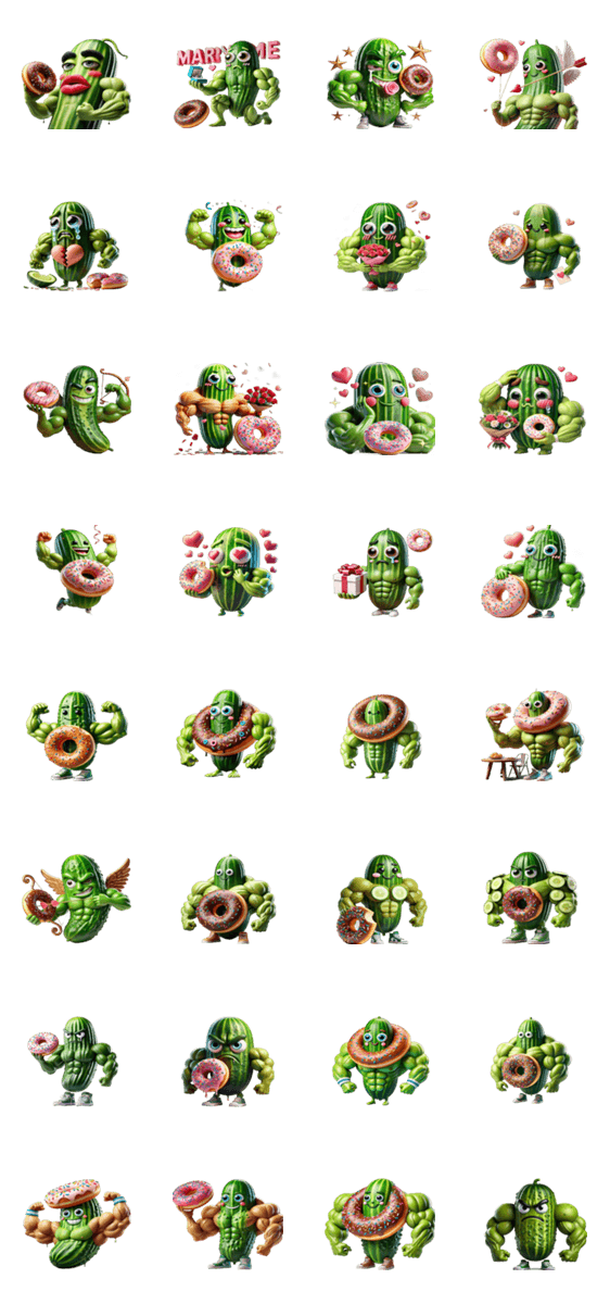 | スタンプ説明 | "キュウリ, ドーナツ, 初対面, 気まずい, かわいい, ユーモア, 楽しい, LINEスタンプ, 絵文字ステッカー, イラスト, |