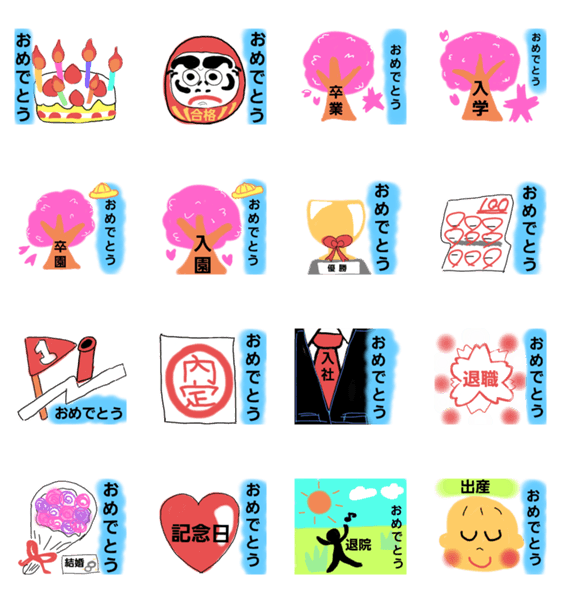 あらゆるシーンで使えるいろいろなおめでとうスタンプ。誕生日 合格 卒業 入学 卒園 入園 優勝 テストで100点 リレーで1位 内定 入社 退職 結婚 ○○記念日 退院 出産