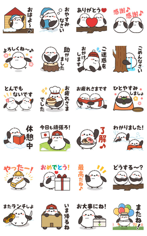ほわほわしたかわいいシマエナガさんのスタンプです。 季節を問わず送りやすい文言がたくさんあるのでとっても便利!