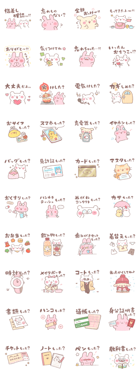 ほんわかアニマル達と一緒に、戸締り・持ち物の確認ができるスタンプです。バタバタするおでかけ前も、家族や友達とスタンプをサクッと送りあって安心しておでかけしよう♪