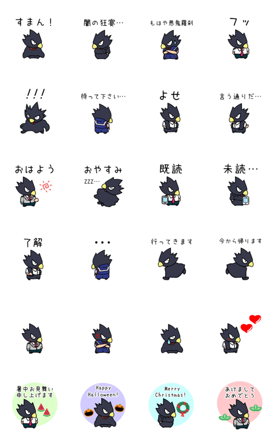 丸くなった常闇くんの可愛いスタンプです。原作のセリフも行事や普段使いできる挨拶スタンプもあります。とこやみふみかげ/ツクヨミ/僕のヒーローアカデミア/ヒロアカ ※LINE Creators Collaboration 僕のヒーローアカデミア参加スタンプです。