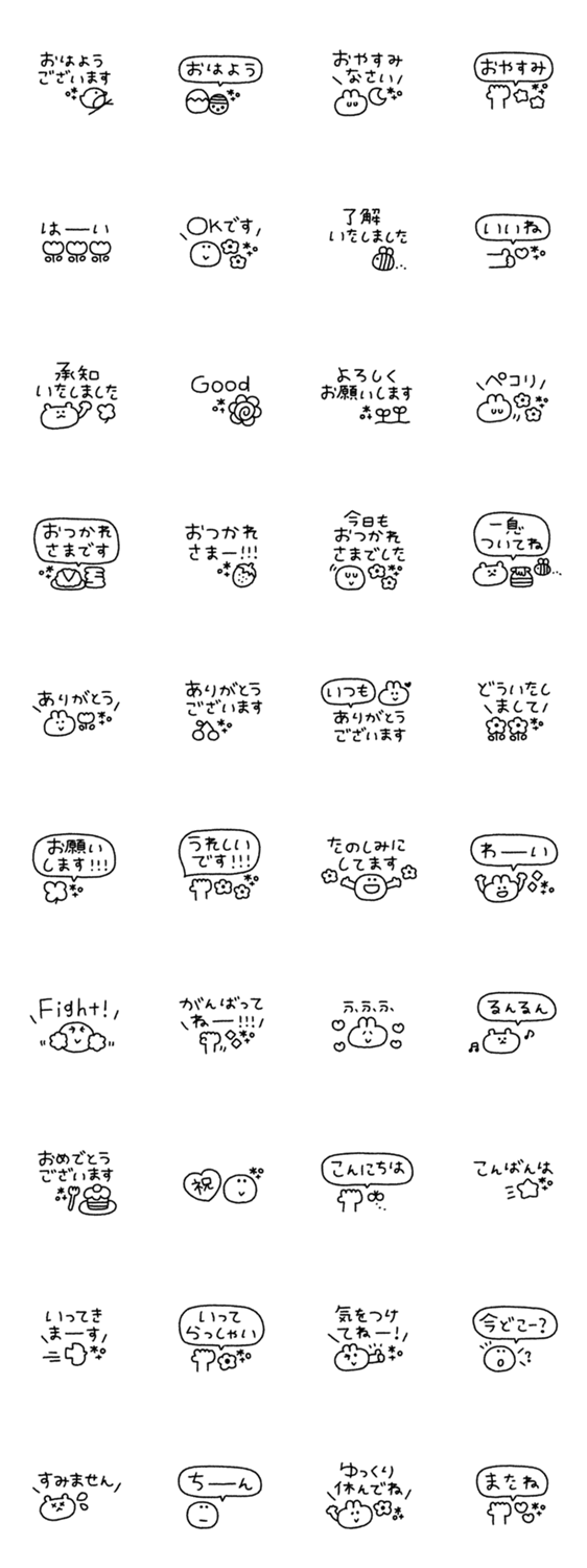 ゆるい手書きのメッセージスタンプです! あいさつ/線画/うさぎ/くま/スマイル/春