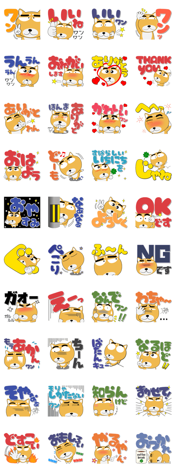 まゆ毛が特徴的な愛らしい柴犬(しばいぬ、豆しば)のスタンプ。毎日よく使う言葉がデカ文字で勢ぞろい。見やすい、使いやすい。「犬の日」特集の再販です。