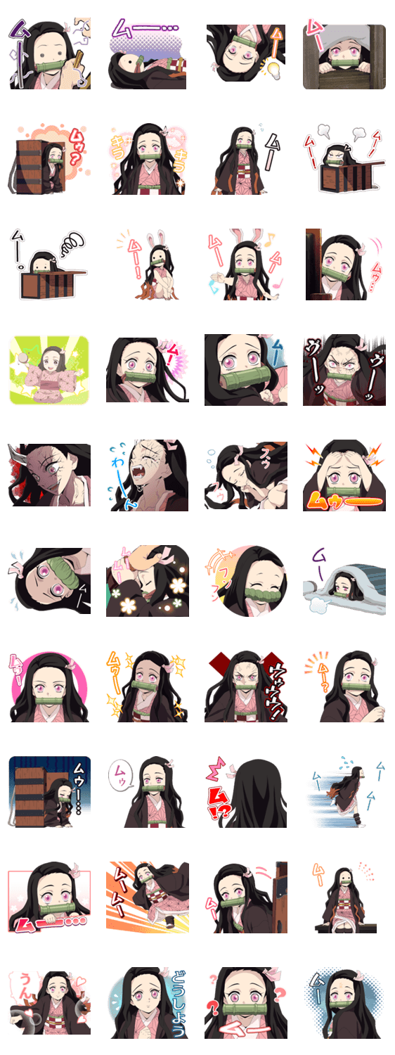 TVアニメ「鬼滅の刃」より、禰豆子に焦点を当てたスタンプが登場!竹筒を咥えた可愛い姿と、表情豊かな様々な「ムームー」が毎日使いたくなるスタンプです!