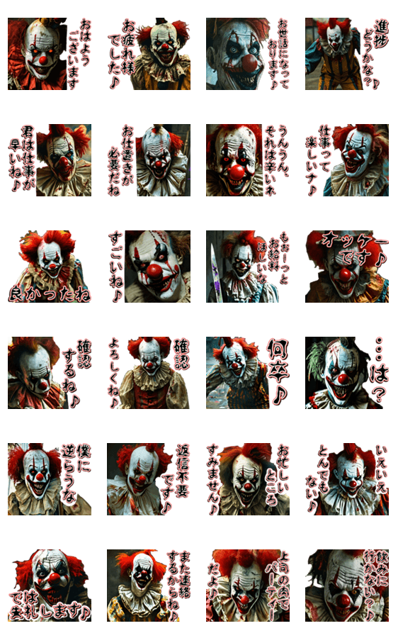 健気に仕事を頑張るピエロのスタンプ。毎日、彼はポリ袋と包丁を持って、どこかで仕事を始めます。/ホラー/ホラー映画/サイコパス/シリアルキラー/悪魔/おばけ/びっくり/