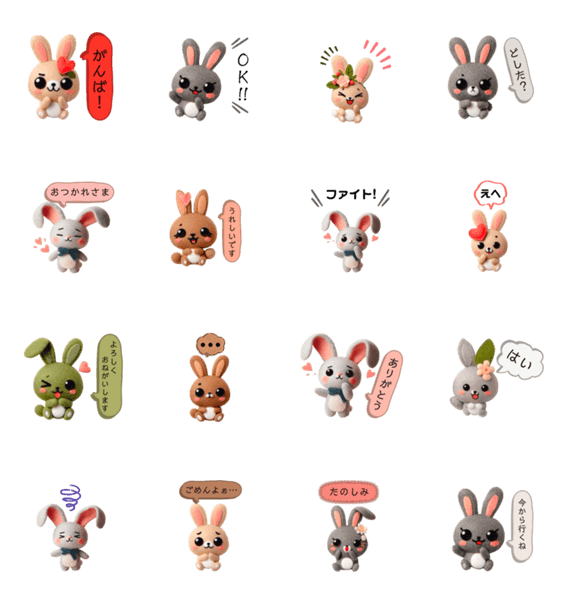 | スタンプ説明 | ふんわり可愛いフェルト素材のうさぎスタンプです。手作りの温かみと愛らしいデザインをお楽しみください。 |