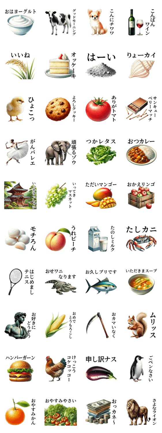 | スタンプ説明 | あいさつ/ネタ/おもしろい/家族/友達/ギャグ/毎日使える/だじゃれ/駄洒落/よく使う言葉/シンプル/年中/日常/使いやすい/面白い |