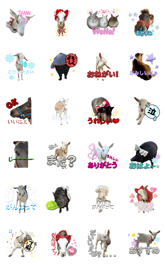 ヤギのチロリを中心にした挨拶スタンプです。ヤギ、ブタ、馬、うさぎとたくさんの動物が登場します。