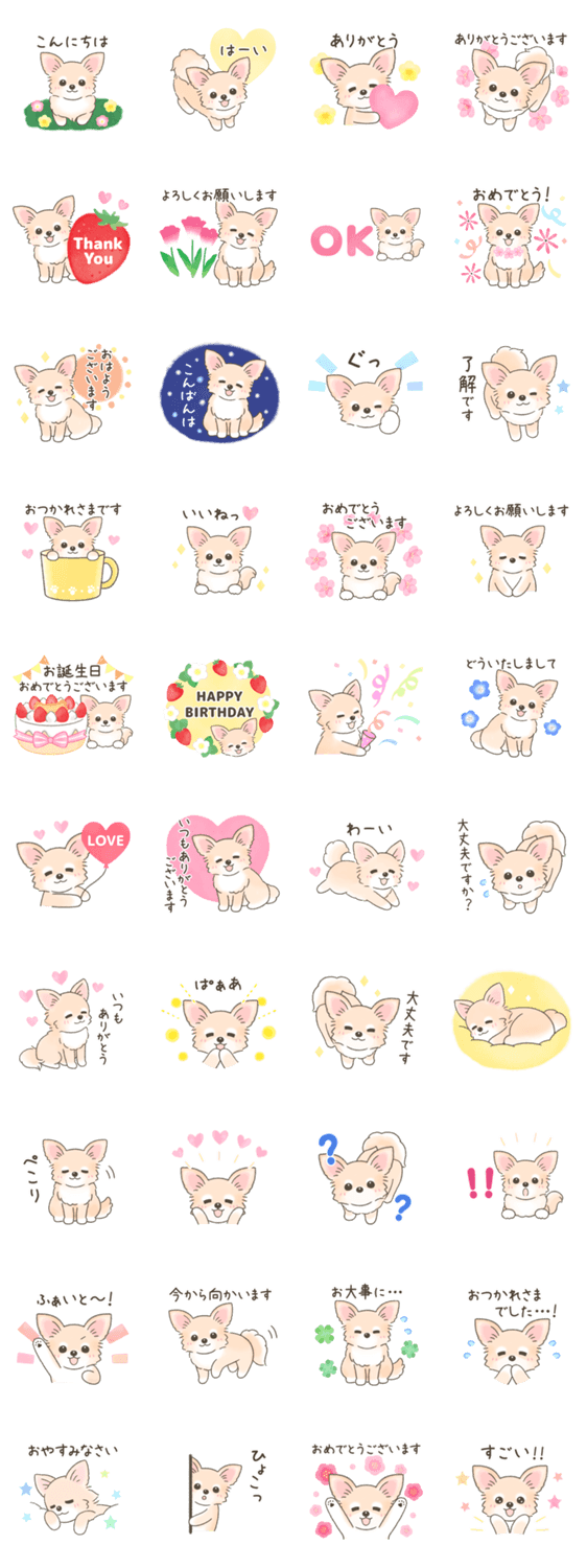 ふんわり可愛いチワワちゃんの春スタンプ。ありがとう・おめでとうのメッセージ多め♪ 丁寧な言葉とやさしいタッチでどんなシーンでも大活躍♡