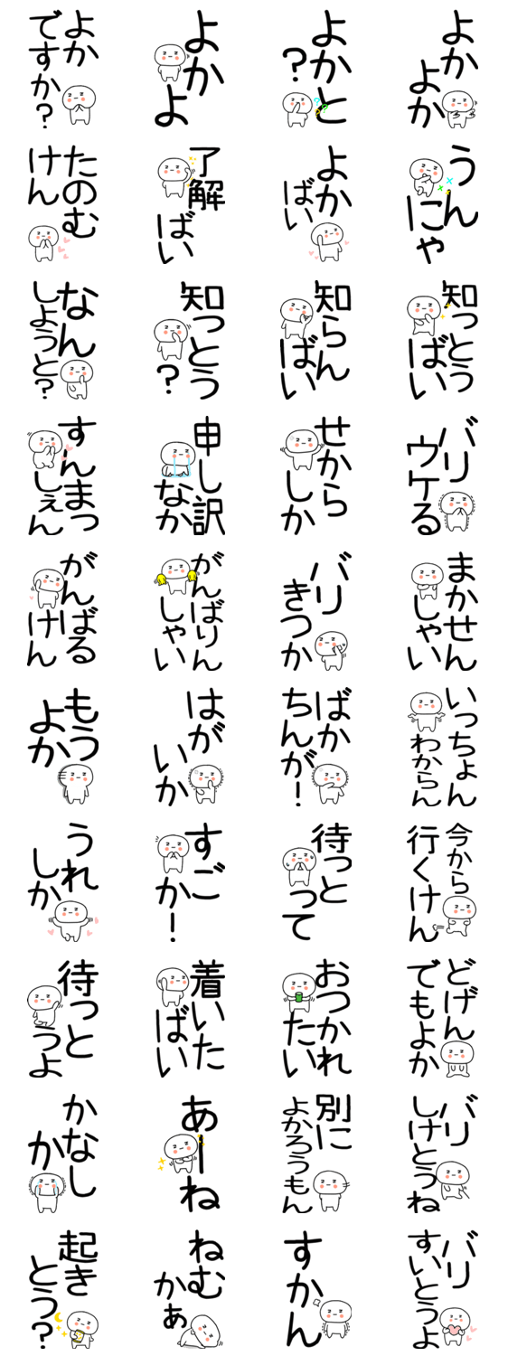 老眼でも見える日常で毎日無難に使える「博多弁」のスタンプです。しろくてまるいキャラクターです。(もるきゅた作) ※このスタンプはトークルームで大きく表示されるBIGスタンプです。