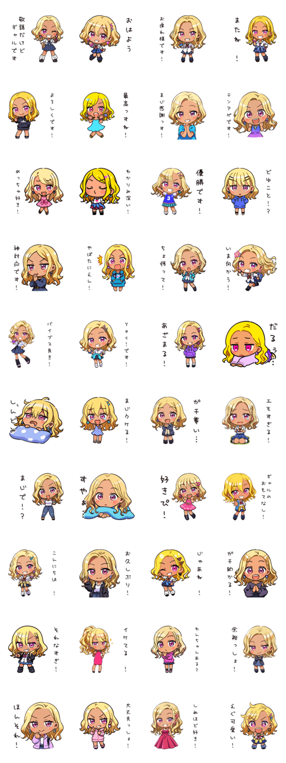 ノリが良くて礼儀正しいギャル先輩の元気なスタンプ!丁寧だけどフレンドリーな表現で、楽しく使える♪日常会話にピッタリ!