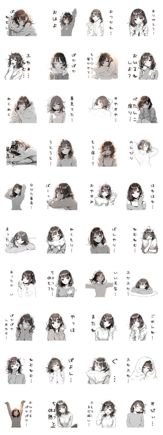 ぽかぽか陽気にうたた寝する癒し系スタンプ!眠い、まどろみ、リラックス感たっぷりの表情で、ゆるっとした会話にぴったり。ほっこり気分をLINEで伝えよう!